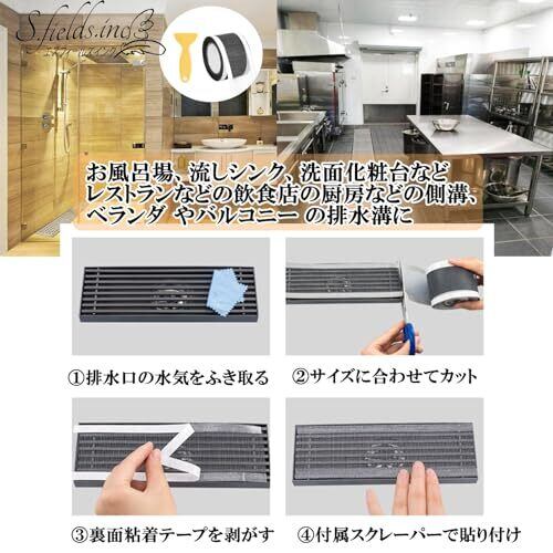 排水溝カバー虫侵入防止メッシュシートフィルターです。[7cm×5m][12cm×4m][10cm×10m]の3サイズからお選びいただけます。 髪の毛や食品の破片などのごみによる排水溝の詰まりを防ぎ、下水管などから上がってきた虫の侵入を防ぐシートです。ゴキブリなどの害虫対策として最適です。 シート両端の粘着テープでしっかり貼ることができ、柔軟性があるため排水溝の形に合わせて貼ることができます。ハサミでシートを排水溝の大きさに合わせてカットすることができ、専用スクレーパーできれいに貼り付けます。 ご家庭のお風呂場、流しシンク、洗面化粧台などの排水口のヘアキャッチャーとしてだけではなく、レストラン、ラーメン店や居酒屋などの飲食店の厨房などの側溝、ベランダ やバルコニー の排水溝にもお使いいただけます。 【サイズ】7cm×5m / 12cm×4m/ 10cm×10m【カラー】ブラック【材質】ポリエステル繊維【付属内容】専用スクレーパー付き