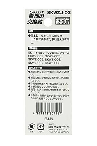 用途:鷲掴ドリルチャックシリーズの交換軸 特徴:衝撃を分散し耐久性を向上させた高耐久圧入軸 軸取り付けネジサイズ:1/2-20UNF 対応機種:SKWZ-002、SKWZ-003、SKWZ-005、SKWZ-006、SKWZ-007、SKWZ-008 入数:1本