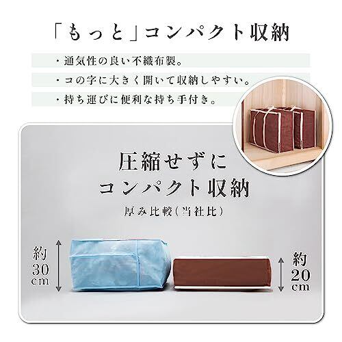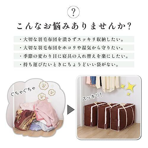 【商品仕様】:サイズ/約幅66×奥行20×高さ47cm、カラー/ブラウン、内容/2枚、収納目安/シングルサイズの羽毛布団1枚、材質/ポリプロピレン 【通気性に優れた不織布製】:通気性の良い不織布でオフシーズンの羽毛布団をホコリから守り保管。 【縦型で立てて収納できる】:スリムな縦型でクローゼットや押入れの中などに立てて収納できる。 【持ち手で簡単に持ち運び】:持ち手付きでクリーニングに出す際や引っ越しなどの際も持ち運びがしやすい。 【持ち手で簡単に持ち運び】:ダブルスライダーでコの字にガバッと開くので羽毛布団の出し入れがスムーズ。