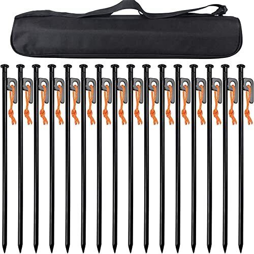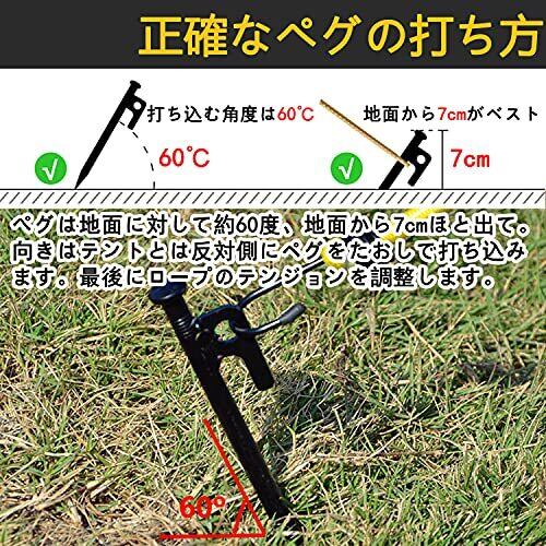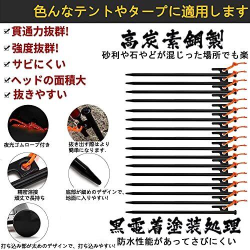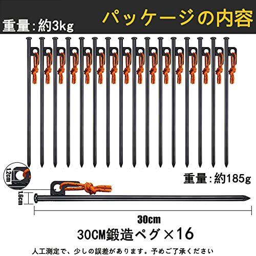 【材質】:丸鋼 【サイズ】:長さ30cm、直径10mm 【重さ】30cm (約)185g/本 【 ペグセット】30cm16本のペグセットです。シーンに合わせて使い分けが出来ます。 万が一商品の数が足りない、間違っている場合がございましたら、ご連絡ください。 本製品の表面は黒電着塗装処理してます。水分があるところで使ってもカビが入りずらいです。 打ちやすいデザイン:強く堅実に地面へ打ち込めるのは、円柱形のヘッド形状だからこそ。ハンマーで叩く際に滑りにくいので、打撃力を確実にボディに伝えます。 【収納袋付き】 スチール製ペグが重いのため、収納ケースはいつも破れるという悩みがお客様がいると思いますが、この商品には600Dオックスフォードで作られた収納袋がついております。収納袋が破れる恐れがなかなかないと思います。 優しいところ:本製品には反射材入りの固定ロープがついております。夜中で撤収する時、ちょっとした光があれば、すぐペグの位置を確認とり、回収簡単となります。
