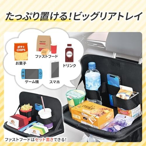 大型リアトレイ&ティシュボックスも収納できるシートバックポケットです。(耐荷重約2Kg) トレイ部は小物がいろいろと置けるワイドサイズ。マルチバンドで500mlペットボトル、500ml紙パック、スマートフォンも置くことができます。 便利なティッシュカバー付きでティッシュボックスを収納できます。ゴミ袋を吊り下げできる便利なフック付きです。 本体前面にはトレイ部を閉じた状態でもスマートフォンなどが収納できるポケット付きです。本体下部はトレイ部を閉じた状態でもドリンクなどが収納できるメッシュポケット付きです。 ●シート背面にフィットする固定用ヒモ付きで、本体のたるみや、走行時などの揺れを抑えることができます。