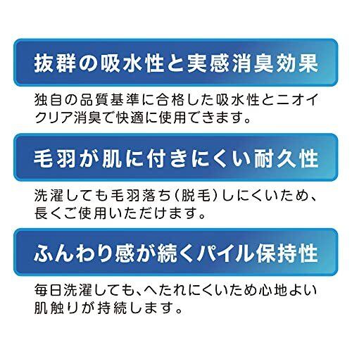 消臭力×今治品質の高機能 綿100%タオル。 サイズは使いやすい34×80cm。 特殊化学結合消臭糸「ニオイクリア」使用で汗や加齢によるニオイを分解・消臭。糸そのものに消臭機能があるため、洗濯しても効果が持続。 高い吸水性/独自の品質基準に合格した吸水性とニオイクリア消臭で快適に使用できます。 羽毛が肌につきにくい耐久性/選択しても毛羽落ちしにくいため、長くご使用いただけます。