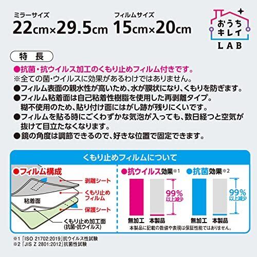 貼り直しOK!気泡が入りにくいくもり止めフィルム付きの樹脂製ミラーです。 抗菌・抗ウイルス加工。SIAA(抗菌製品技術協議会)の安全性基準に適合したフィルム。簡単に貼れて、はがし跡が残りません。 お風呂場でのヒゲ剃りや洗顔に。ミラーサイズ:22×29.5cm、フィルムサイズ:15×20cm。 ゆがみが少なく割れにくい、貼り合わせ二重構造です。吸着シートで簡単に取り付けられます。 入浴時にシャワーで濡らすことにより、表面に水の層をつくり出してくもりを防ぎます。