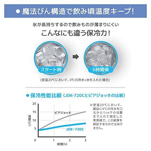 魔法びん構造で快適! 氷を入れてもたっぷり飲めるジョッキタイプ。グラデーションカラーモデル サイズ(約):幅12.5×奥行き8.5×高さ16cm、本体重量(約):300g、容量:720ml 保冷効力:7℃以下(1時間)、食洗機対応 原産国:中国 素材・材質:本体:ステンレス鋼(アクリル樹脂塗装)/ ハンドル:ABS樹脂