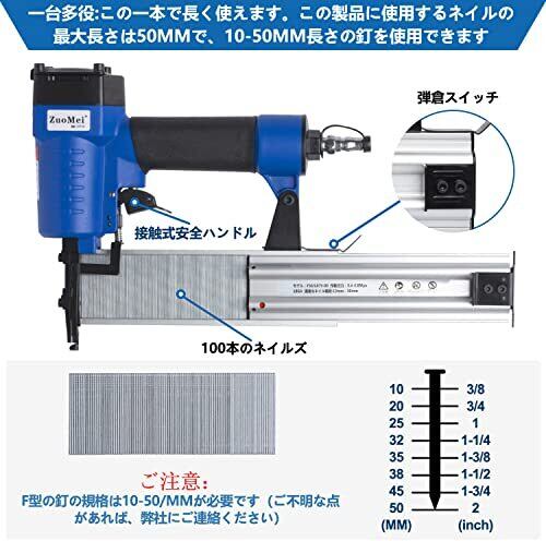 【パラメータ / セット内容】使用空気圧力範囲0.4-0.8mpa、最大使用空気圧力1mpa、打つ回数:10万回 、使用可能な釘の長さ:15-50MM 装填数:100針 本体重量:1.2kg / タッカー本体×1、釘×1000枚、日本語説明書×1、六角レンチ×2、ネイルガン収納ボックス×1、 (画像展示部品はすべてあります) 【ミッシング防止装置】釘打ち作業の安全を確保するため、本機は接触式安全スイッチデザインを採用しています。釘打ち機が作動しているときは、ガンヘッドをターゲットに押し付けると同時に、レンチスイッチをトリガーして釘を発射する必要があります。ただレンチスイッチをトリガーすると、ネイルガンは発射されません。偶発的な釘ミッシングによる損傷を避けます。 【商品特徴2】多規格な釘が使用可能、コスト節約:F型長さ10~50mmの釘はすべて使用でき、現在市場のネイル仕様の単一の問題を解決します。(ほかの釘打ち機は釘の最大使用可能な長さは20MM、25MM、35MMなど)いくつかの釘打ち機を買う必要がなく、お金を節約できます。 【商品紹介・用途】一体化アルミダイカスト本体、軽量で人間工学に基づいた滑りにくいグリップの設計により、作業がスムーズで簡単になります♪/ 家の装飾、家の修理. 家づくり、DIYデザインなどの効果的なヘルパーです。 【アフターサービス】商品について、12ヶ月保証が付きます。ご購入する時から12ヶ月間、商品が不良等問題があったら、全額返金または新品交換できます。(注文履歴--出品者に連絡)ご安心ください。