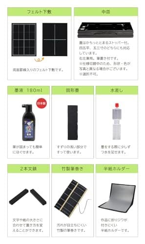 【セット内容】・日本製太筆(3号) ・小筆(8号) ・超軽量プラスチック硯(四五平・研磨剤入り) ・墨 ・墨液 ・文鎮2本組 ・罫線入り下敷き ・筆巻 ・水差し ・中皿 ・半紙ホルダー ・ショルダーベルト コシが強くまとまりやすい日本製太筆のセットです。卒園祝い・卒園記念品、新一年生・新入学準備品、入学祝い・入学記念品に最適!小学校の授業で使える小学生向け書道セットです。 フルオープンで大きく開くので、書道用具の出し入れラクラク!側面に通気性のあるメッシュ素材を使用しているので、カビを防いで清潔に使えます。 墨液は、水洗いすると固まった墨がほぐれます。 汚れが目立ちにくい、黒い布地のシンプルでスタンダードなバッグです。表面にメッシュポケットがついています。【バッグサイズ】外寸 縦26cm×横35cm×奥行6cm