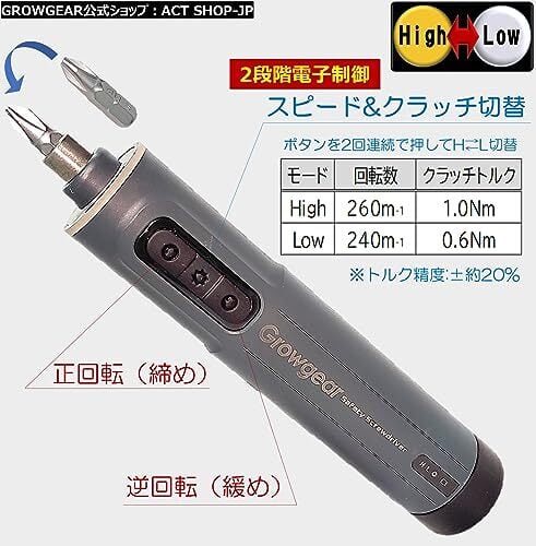 [GROWGEAR] 電動スクリュードライバー 電動 手動 2WAY 電子クラッチ2段階 0.6Nm&1.0Nm USB type-c 3.7V 1200mAh 先端付属30本 小型 充電 ドライバー Safety Screwdriver DIY向け